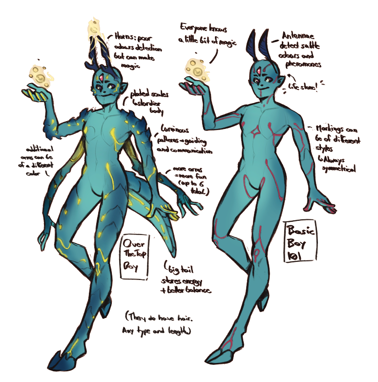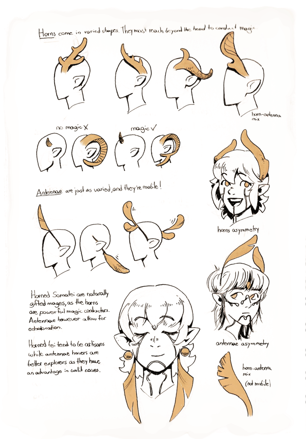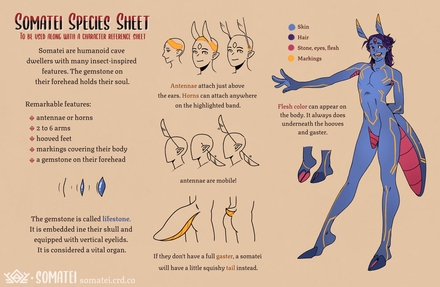 Somatei are a peculiar species: two legs, two to four arms, a pretty pair of antennae, an insatiable thirst for discovery and a body covered with markings that guide the life flowing from the stone set on their skull to the tip of their fingers.