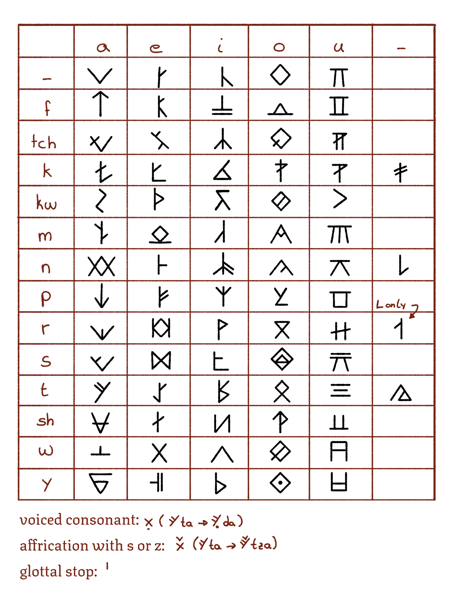 Taletei is the one language spoken by all Somatei. It has a limited number of different syllables and is written with a mix of ideograms and a syllabary. Since they commonly carve text in stone, symbols tend to be made of straight lines. Text is typically written right to left, or top to bottom in some cases. Below you will find the common syllabary and diacritics.