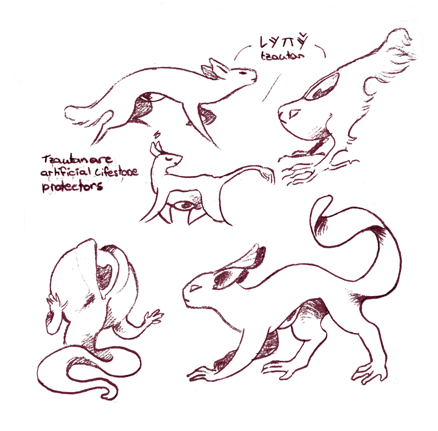 One successful invention though was the tzautan. Tzautan are tiny creatures with a lifestone instead of a heart, grown from successful, small scale grafts of life moss on a variety of kestza. A tautan grown around a tei’s lifestone that has not been plunged into a moss bed since their death retains their memories and can still talk and write to some extent. The resulting creature however will easily get sick or even suffer from necrosis, as if the stone can’t keep it together for long.