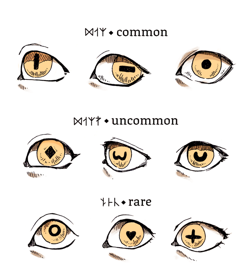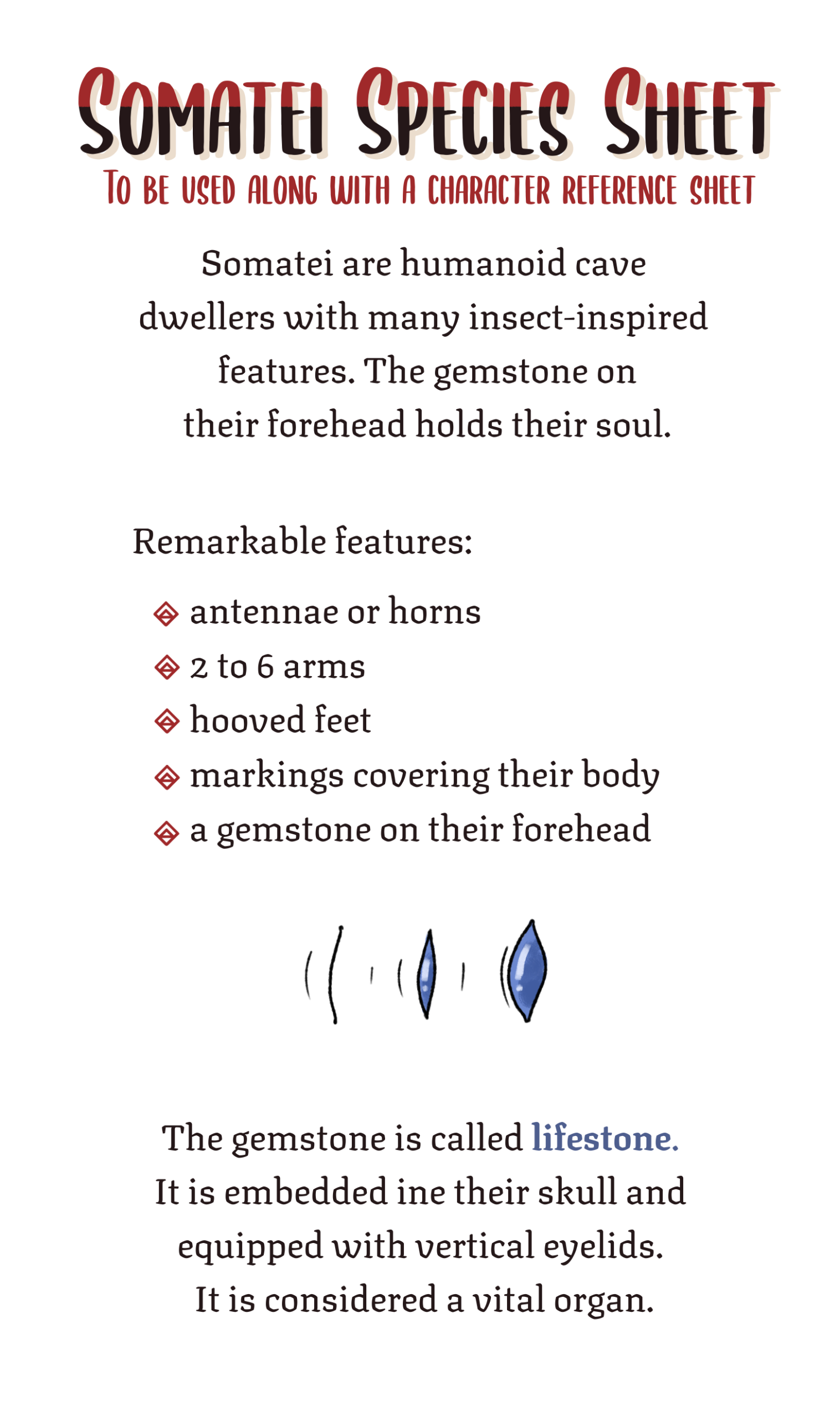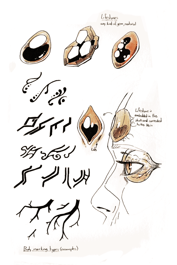 Their skin can be any color and they’re all covered in patterns that have a distinct “style”. The patterns wrap around their whole body and form an indent in their skin.All Somatei have a gemstone (or other hard, precious material such as amber or a fossil) embedded in their skull, in the middle of their forehead. The stone is approximately the shape and size of an eye and has an eyelid. This gemstone is called lifestone and is believed to contain their soul. A Somatei cannot survive without one.