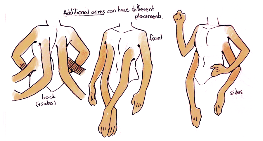 Somatei have at least two arms, but they can have any number up to 6. Additional arms can be attached to their sides, back, or front of their torso in any combination. Each additional pair is thinner and looks more insect-like; additional arms often have only 3 fingers.
