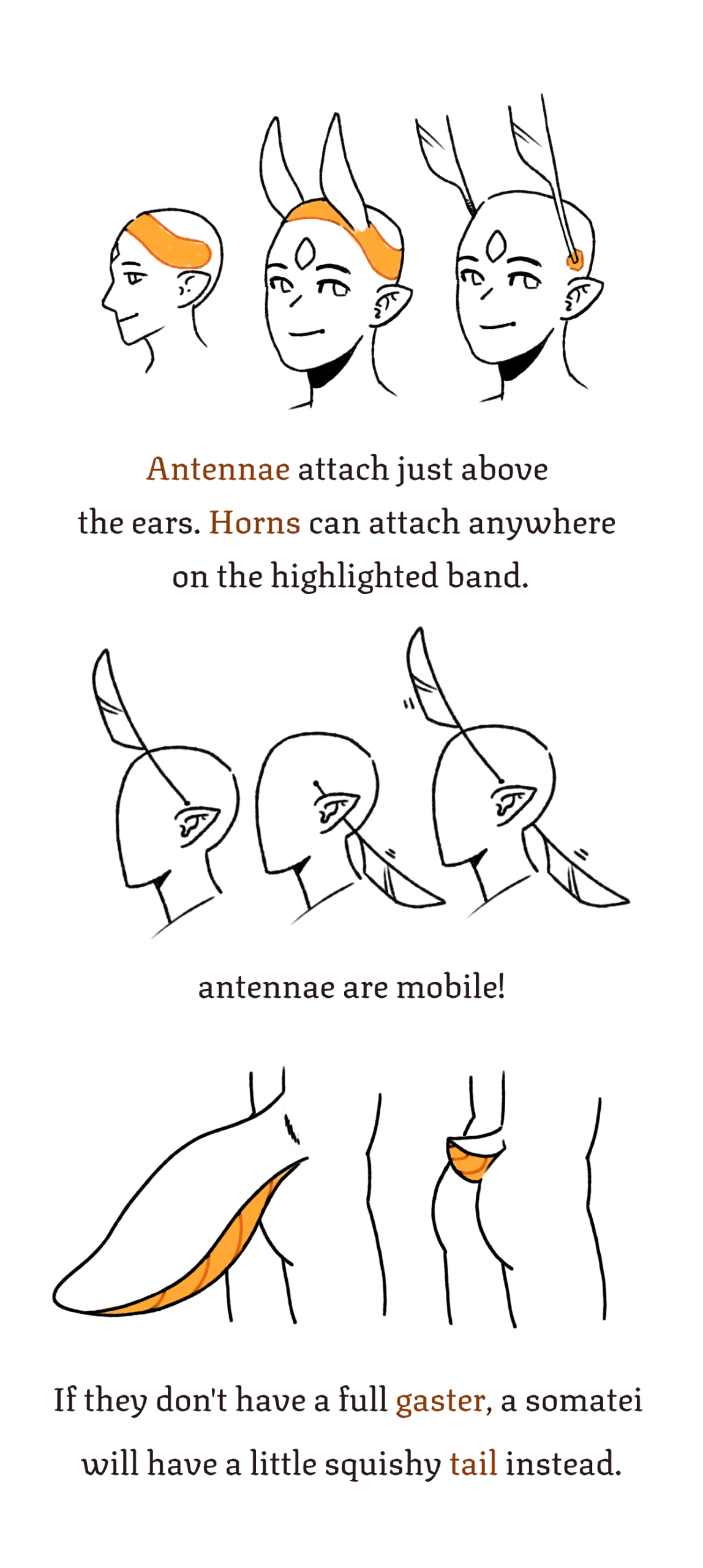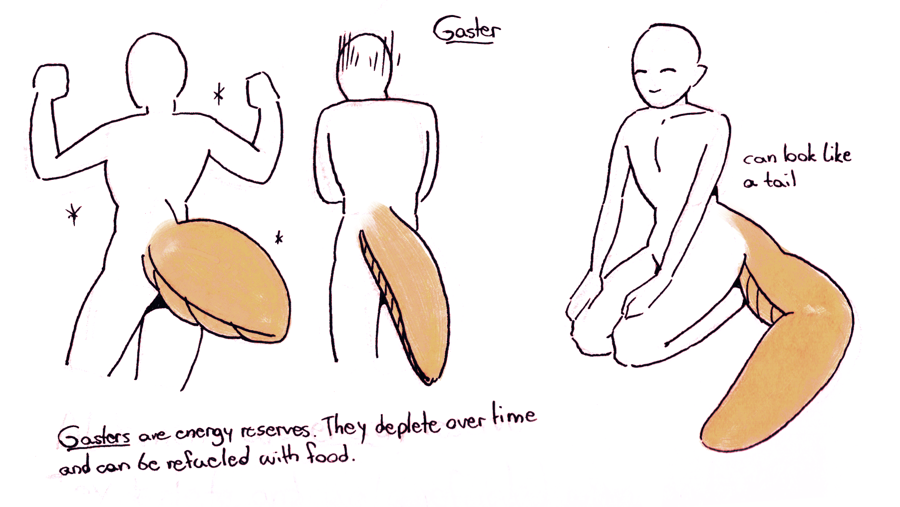 All Somatei have at least a tiny squishy tail, but some have a full blown gaster instead. Gasters are energy reserves that inflate and deflate as their content is refilled or used. They attach to the body on the lower back (similar to a tail). A tei can lift or swing their gaster in a limited manner.