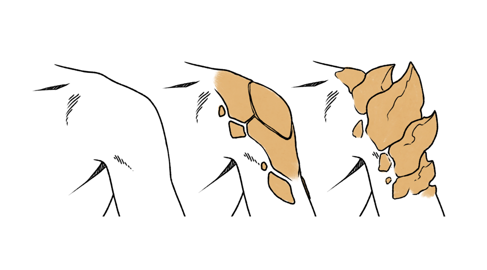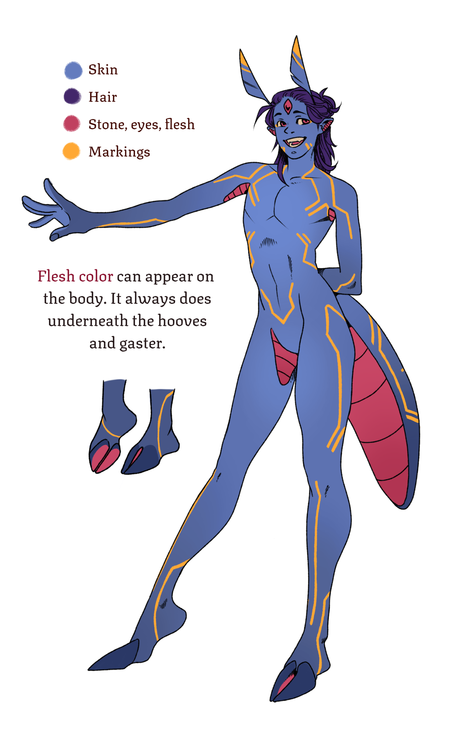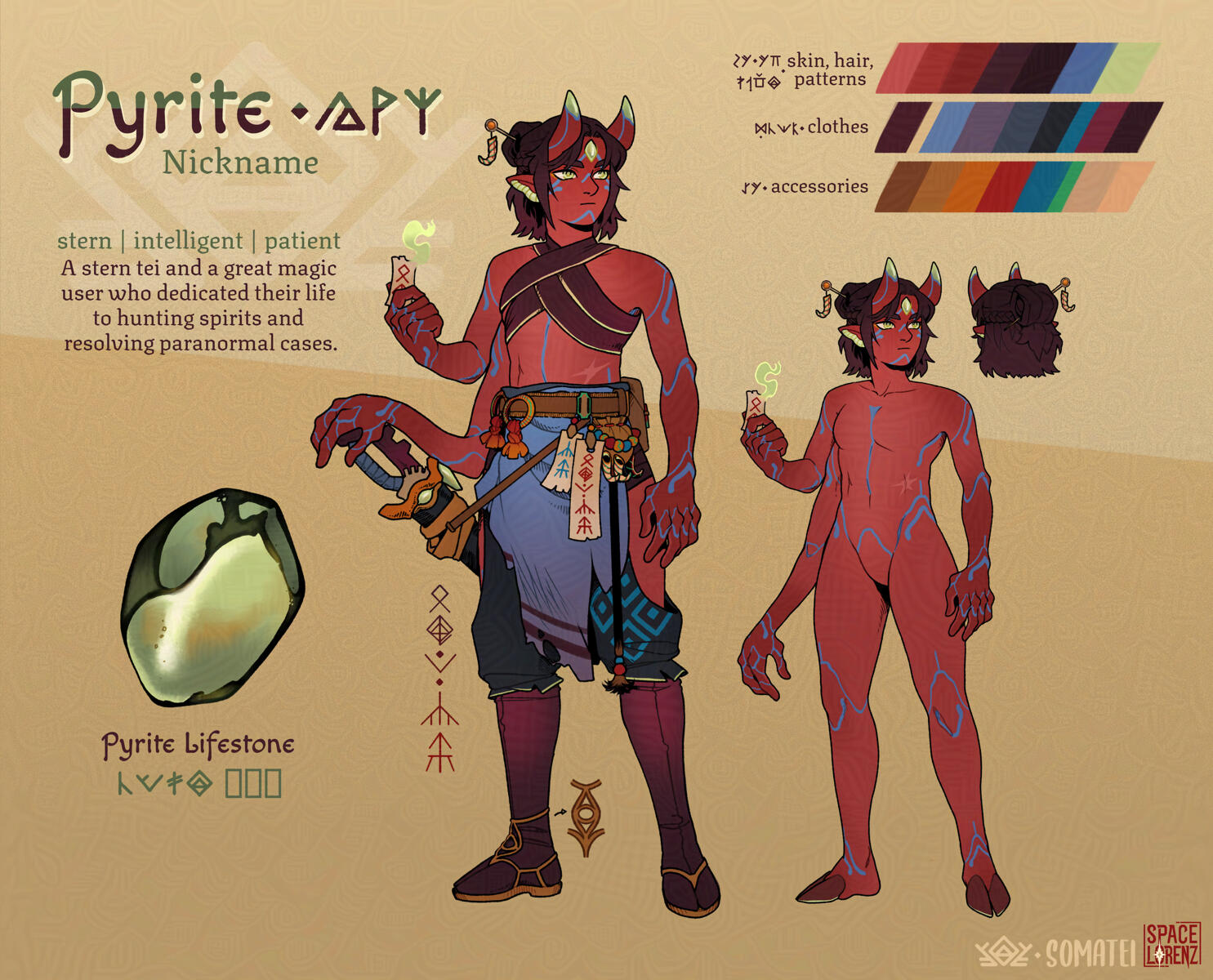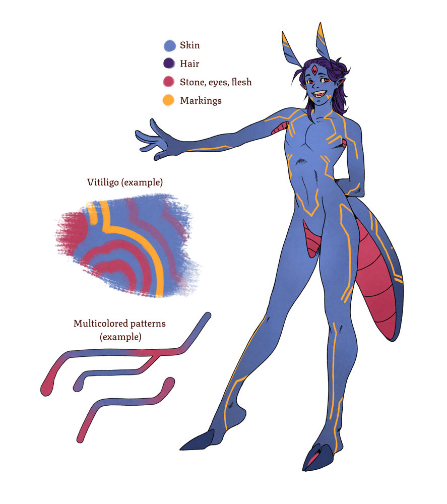 Generally, a Somatei will have 4 main colors: skin, hair, patterns and the fourth shade for eyes, lifestone and flesh. Patterns are often the same colour as lifestone. Skin will usually show a soft, lighter gradient on the chest. Hair can be dyed so it can be any color.Note: the following traits are not mutually exclusive.