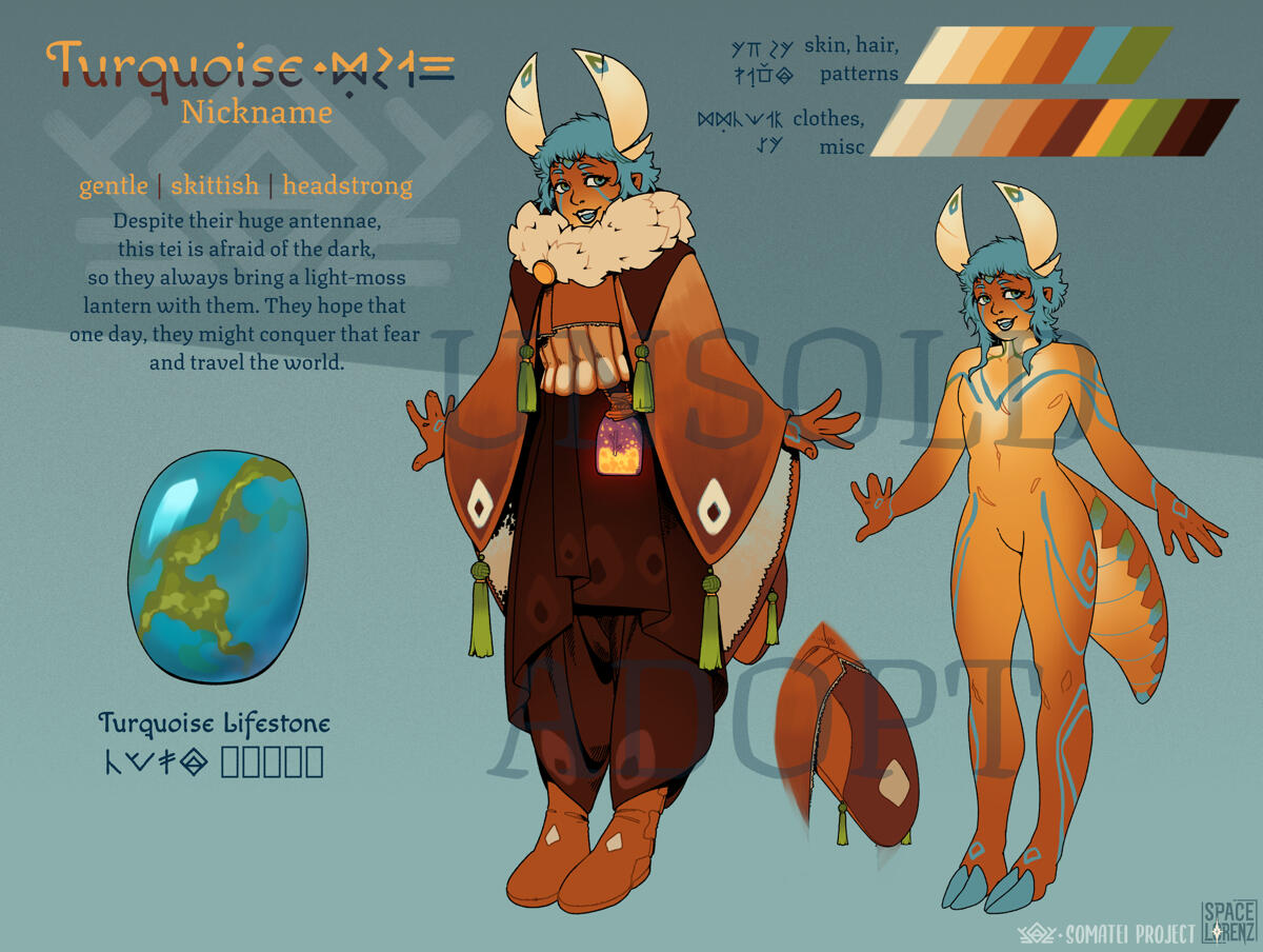 The following rules are subject to change and will be adapted with the species' evolution. They are written assuming members will use common sense but might have to be tightened if needed.Somatei are a species owned by SpaceLorenz. You cannot create a Somatei without SpaceLorenz' explicit permission (a MYO ticket for example). You need to be at least 18 to own one and to join the related discord server.Work related to the Somatei species, be it artwork, text or other content cannot be used in any context using AI image generation. You can sell Somatei-related work you made (for example prints of your character etc.) , and offering commissions in the context of the species is encouraged :)Do not harass members to get gifts or to buy/trade their character. Any cases of theft, scams or similar situations will be sanctioned. Such cases must be reported to SpaceLorenz as soon as possible.Failure to adhere to the rules will result in an immediate blacklisting from the species. By acquiring a Somatei, you automatically agree to the rules.